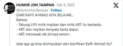 Video wawancara Raffi Ahmad yang menyangkal menggunakan subsidi gas melon viral di media sosial. Salah satunya dibagikan ulang oleh akun X, @HumorJonTampan pada Minggu (9/2/2025) kemarin.