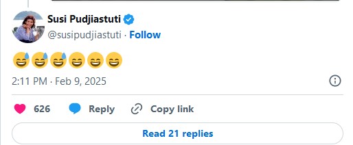 Tak hanya netizen, mantan Menteri KKP, Susi Pudjiastuti ikut mengomentari video Raffi Ahmad soal gas melon. Pemilik maskapai penerbangan Susi Air itu hanya merespons dengan emoji tertawa.